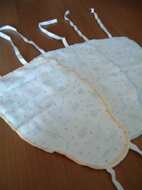あともう一つ、ギプスと体の間に入れる汗取りパットが必要です。(お腹と背中と両方に入れます) これは交換と洗濯を考えて10枚作りました。(先輩ママさんから10枚くらいあると便利と教えていただきました) ベビー用品店に売っている汗取りパットを2枚合わせにして (1枚だとちょっと薄い) 4ヵ所に紐をつけて出来上がり!他にハンドタオルを半分に切ったりガーゼのハンカチを二つ折りにして紐をつけたって人もいましたよ~!