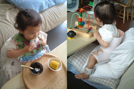 こうすると自分でご飯を食べれるし、おもちゃで遊んだり、絵を描いたりと結構一人遊びが